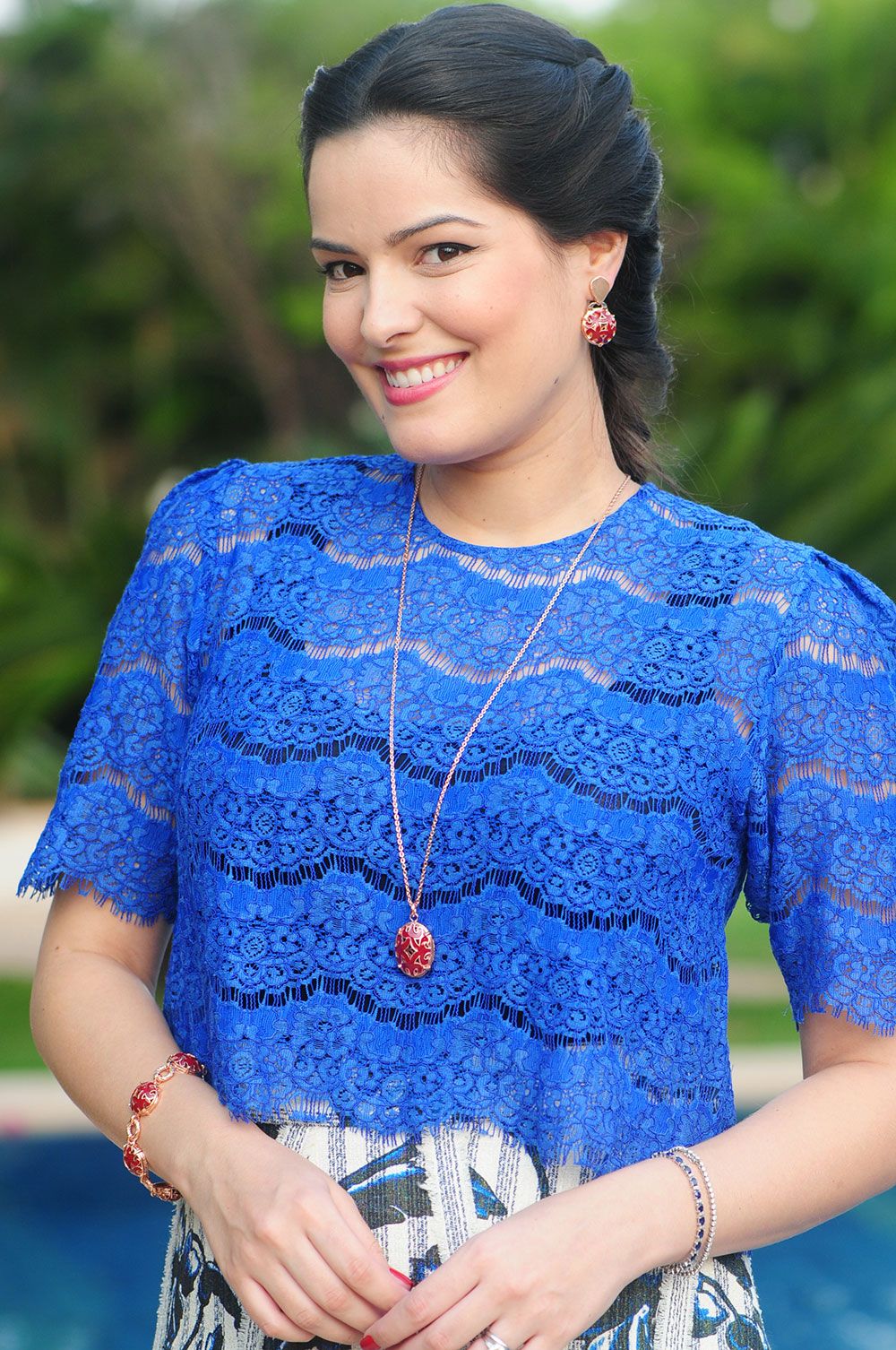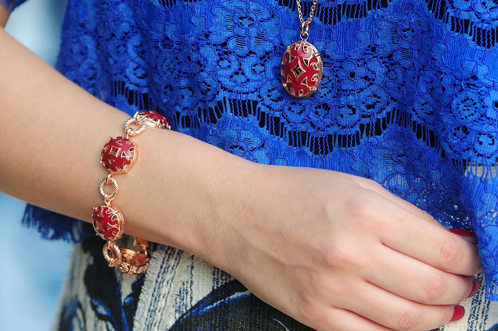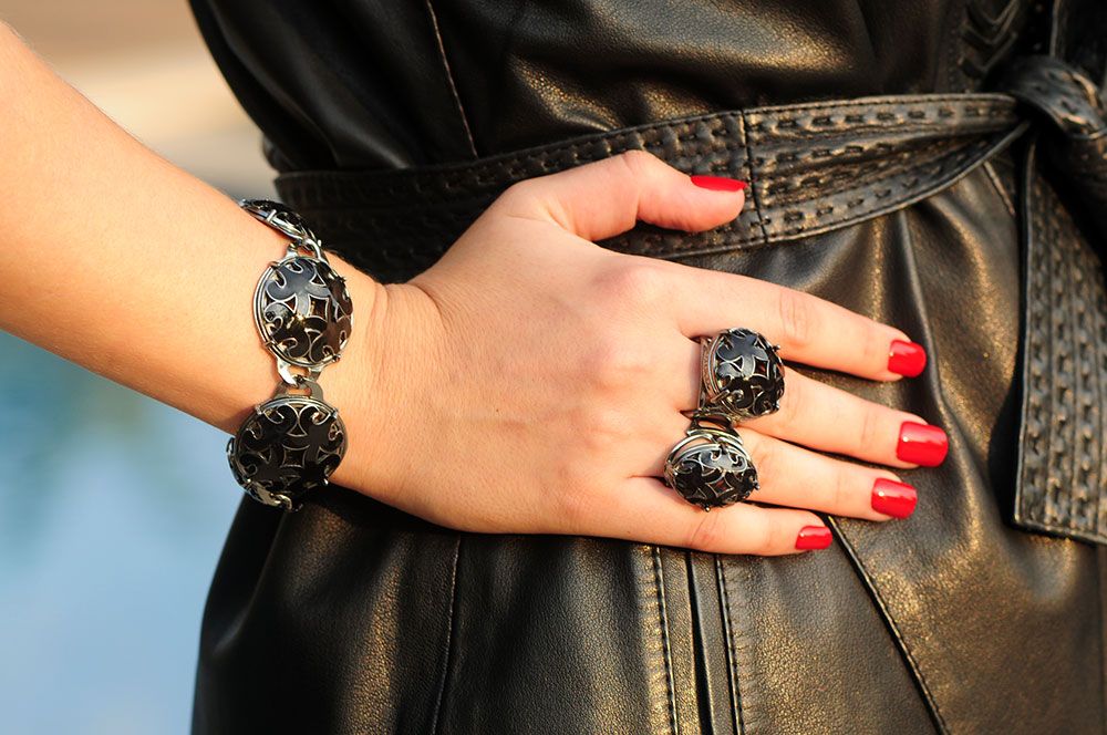 O estilo das peças é o mesmo, variando em anéis, colares, brincos e pulseiras. Mas impressionante como cada cor dá um efeito no look, né? O vermelho mais romântico, o preto mais moderno… Para todos os estilos de mulher! 🙂