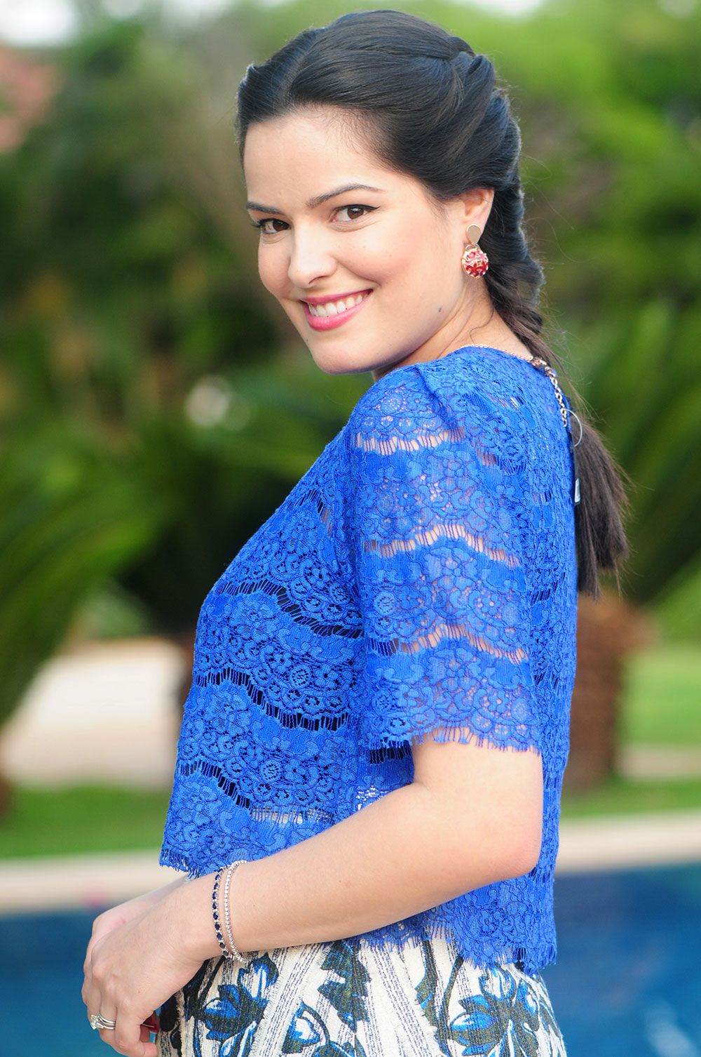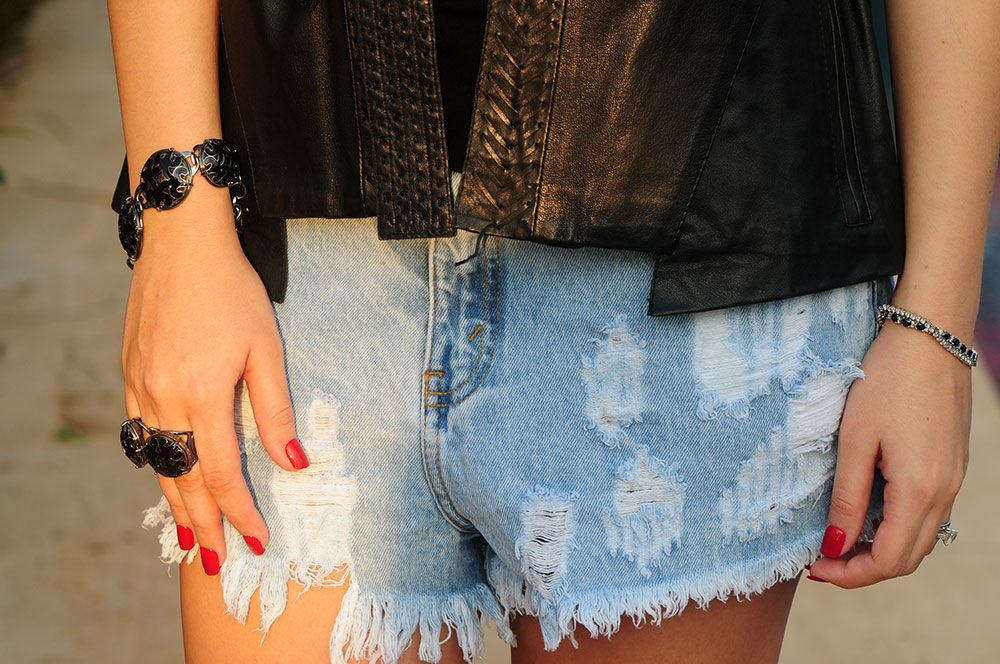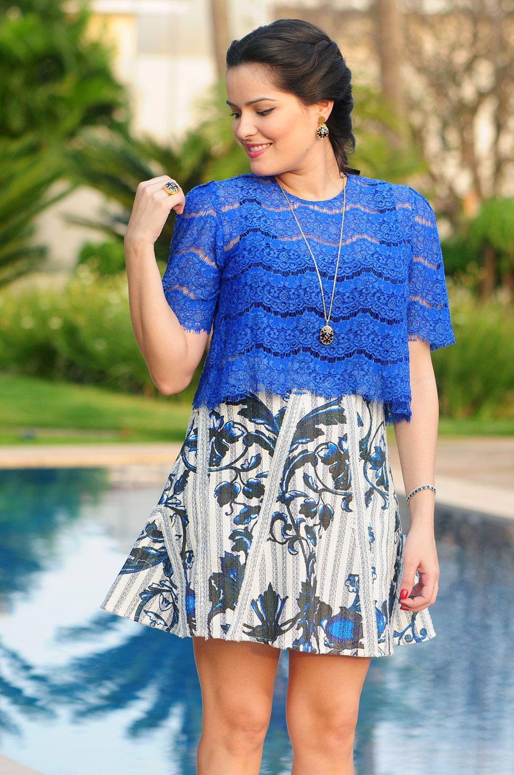 Look saia estampada e top de renda azul Anamac. Short jeans Anamac com colete de couro Talie e camiseta Mixed.