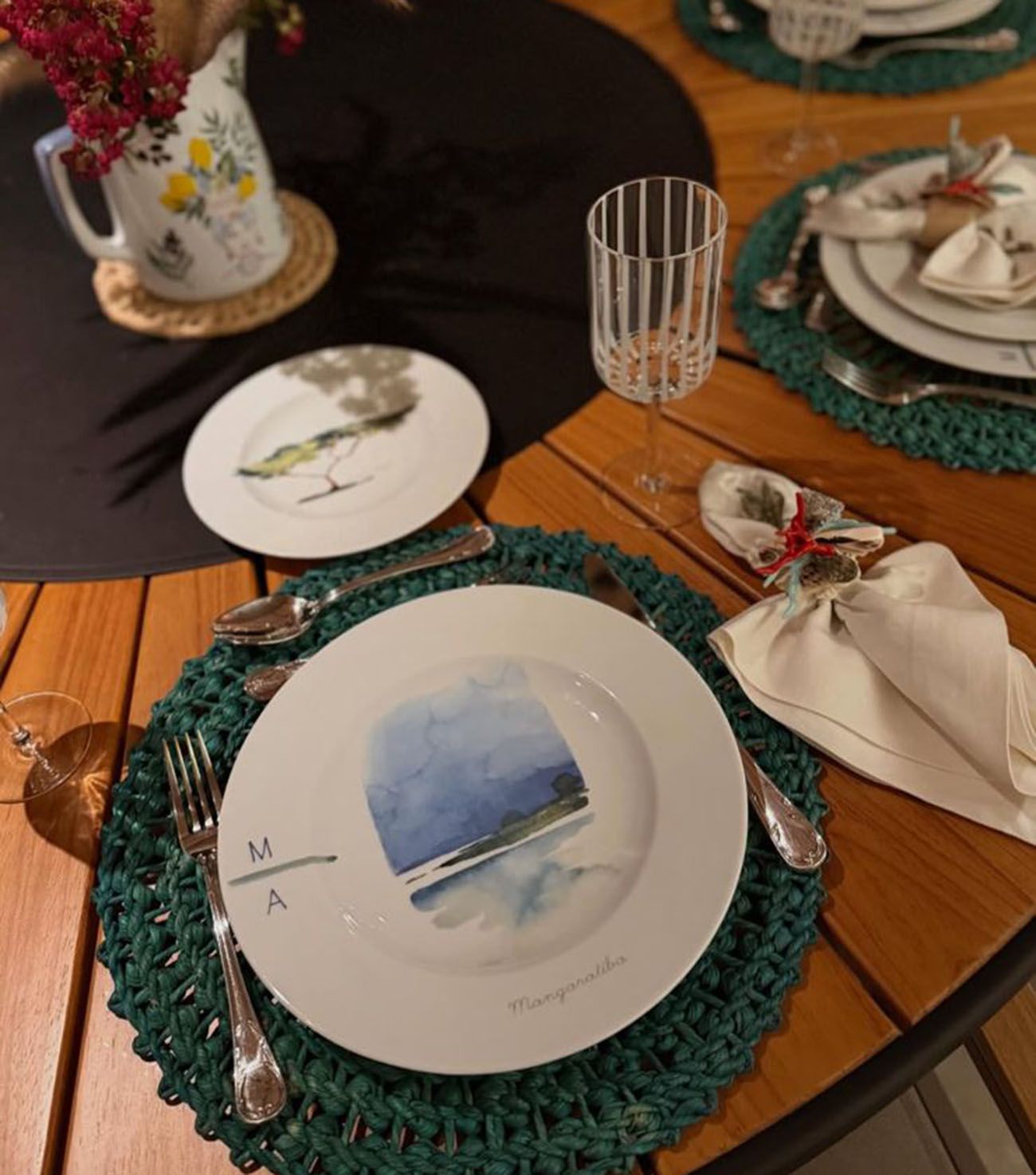 E pra finalziar, essa louça foi pintada à mão e feita especialmente para nossa casa de praia em Mangartiba. Olhem que demais!!! A pintura, as iniciais minha e do Antonio, os desenhos diferentes do prato raso e prato de sobremesa… um amor! Feitos pela Table2 .